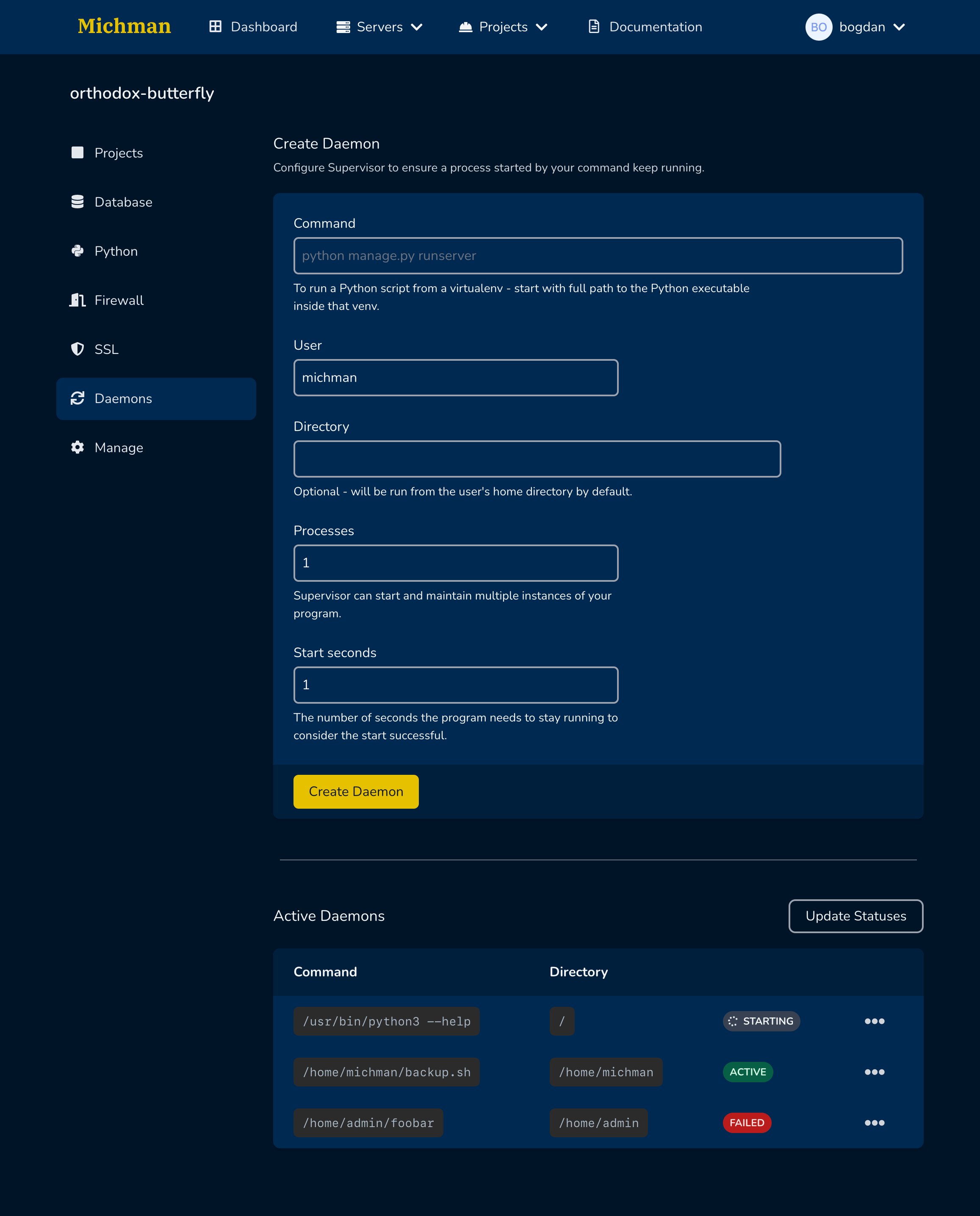Daemons are used to keep long-running scripts and processes alive. For instance, you could have a custom backup script running. If the process exits - Supervisor will restart it automatically.