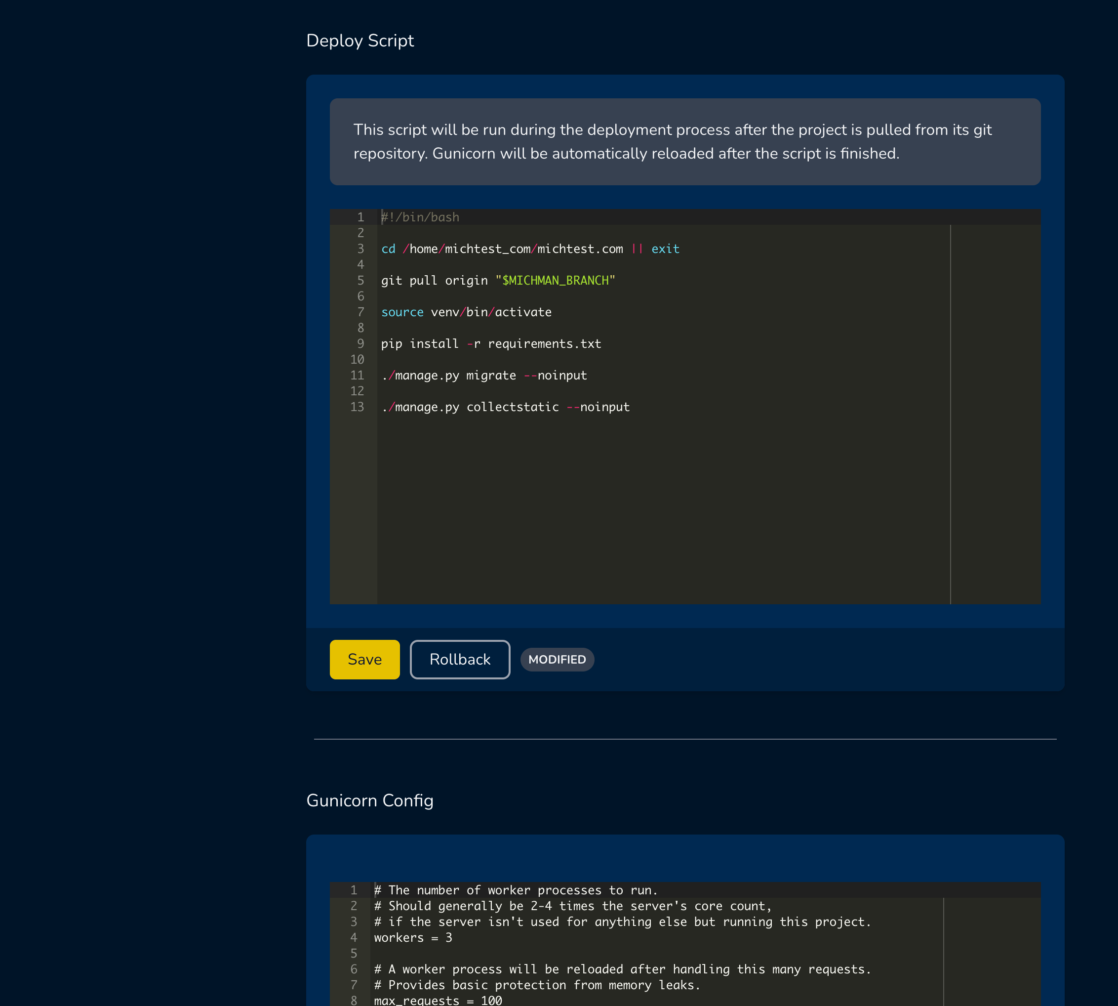 Your projects come pre-configured with an example deployment Bash script tailored for Django or general Python, which will be enough for simple projects.