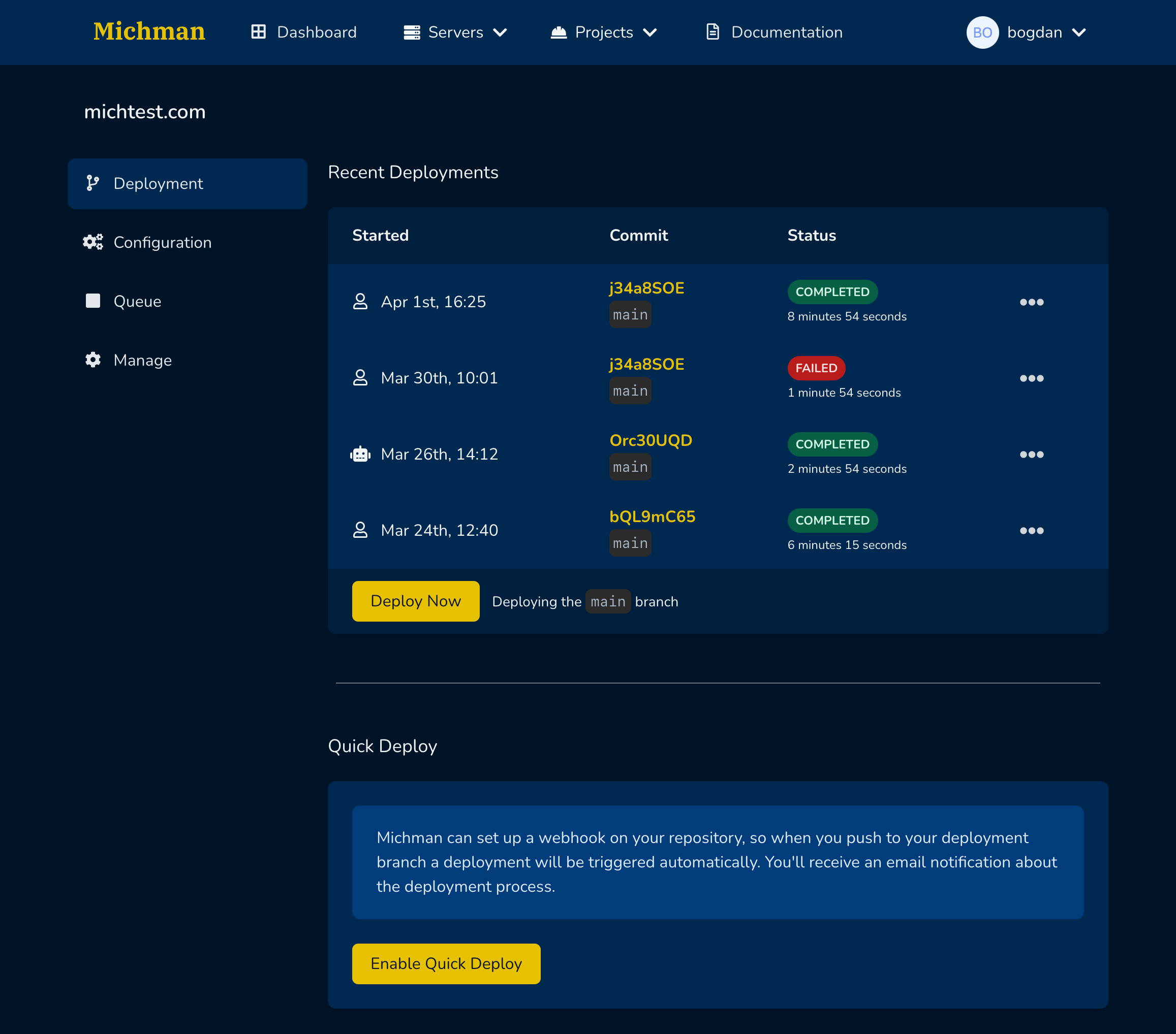 And when all is working you can one-click enable automatic deployments, so Michman will redeploy your app on each git push and notify you about the process.
