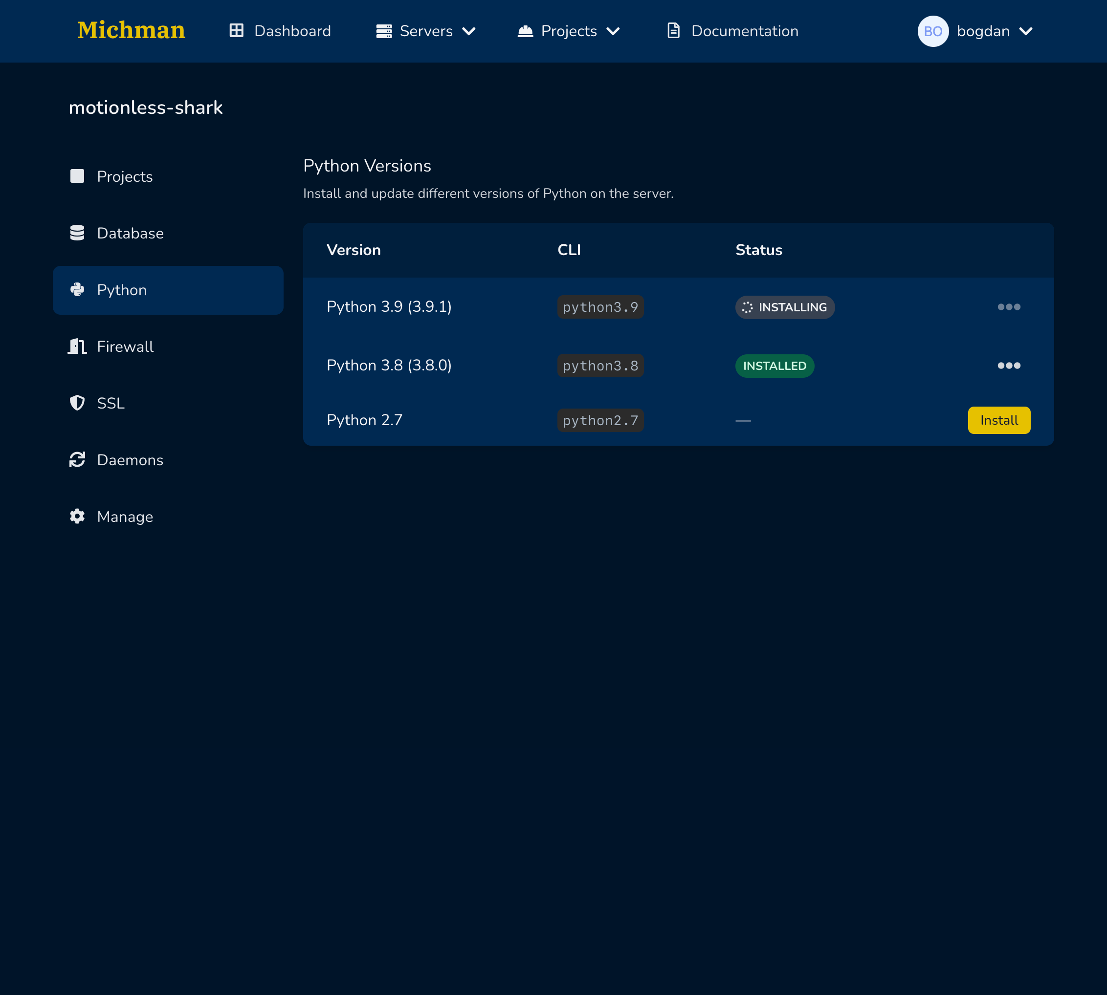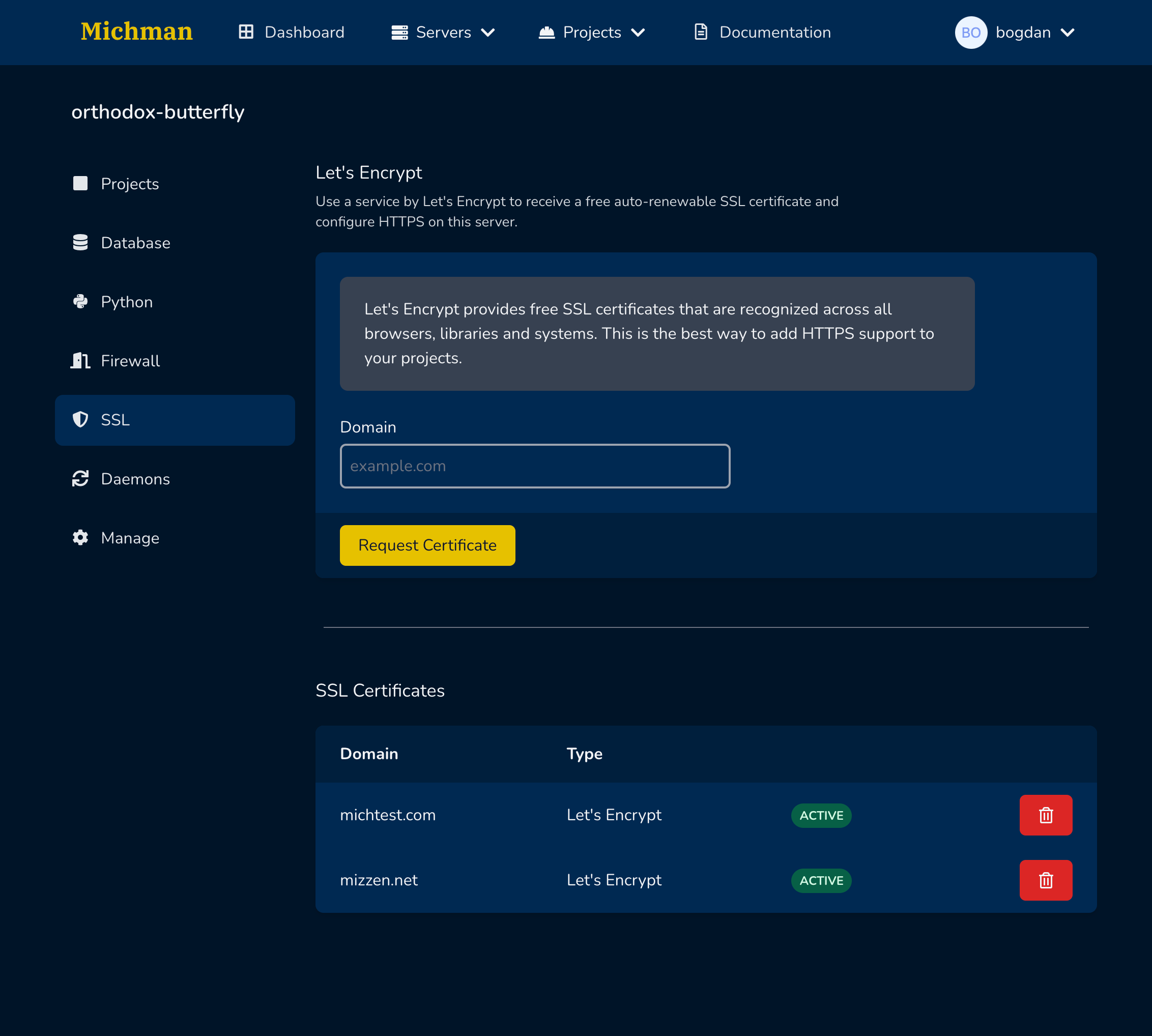 Receive industry-standard SSL certificates for free with the help of Michman and Let's Encrypt. You can have multiple projects on the same server with different domains and SSL certificates running seamlessly.