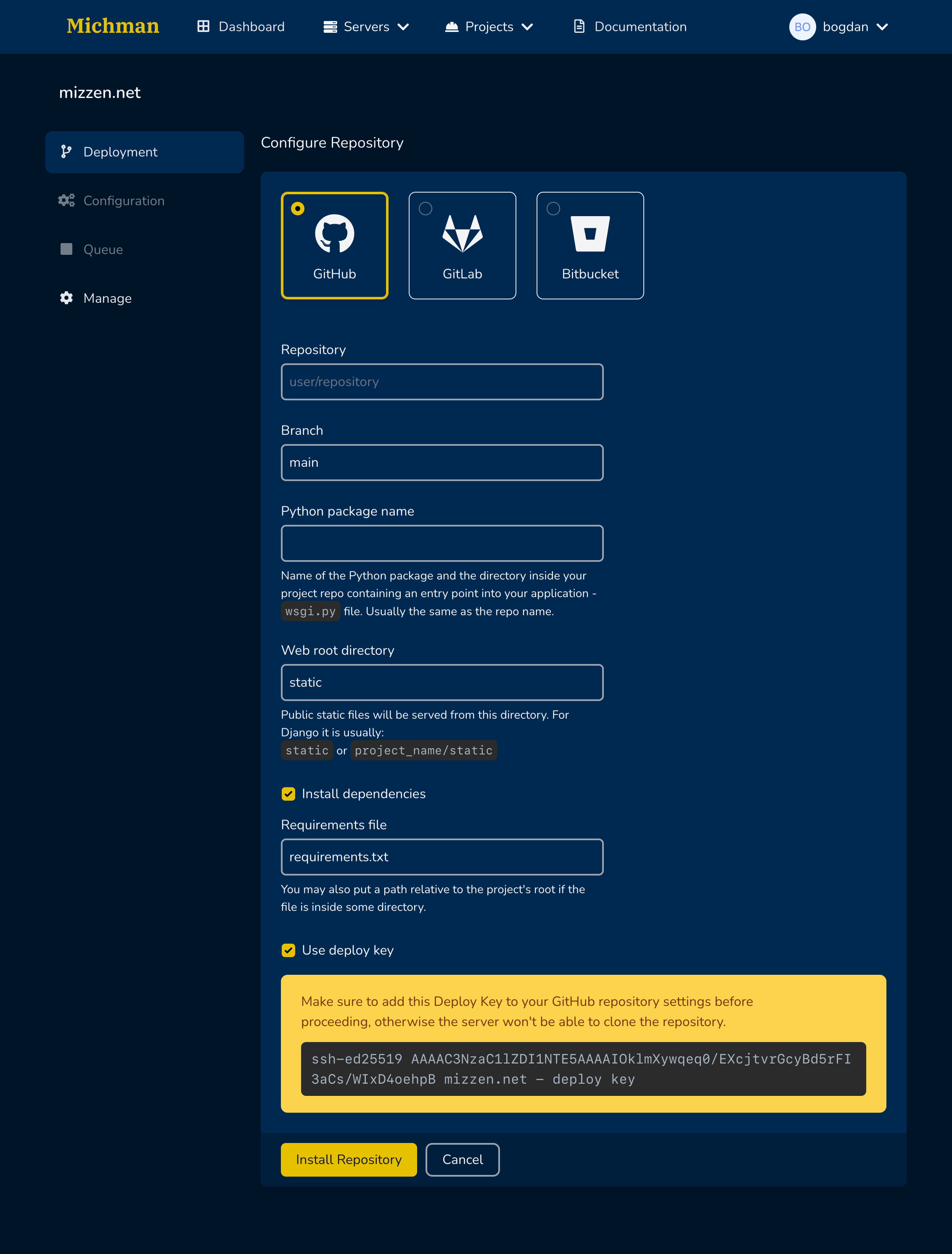 Once it's done you can install your own project from a repository on GitHub, GitLab or Bitbucket in 1 minute.