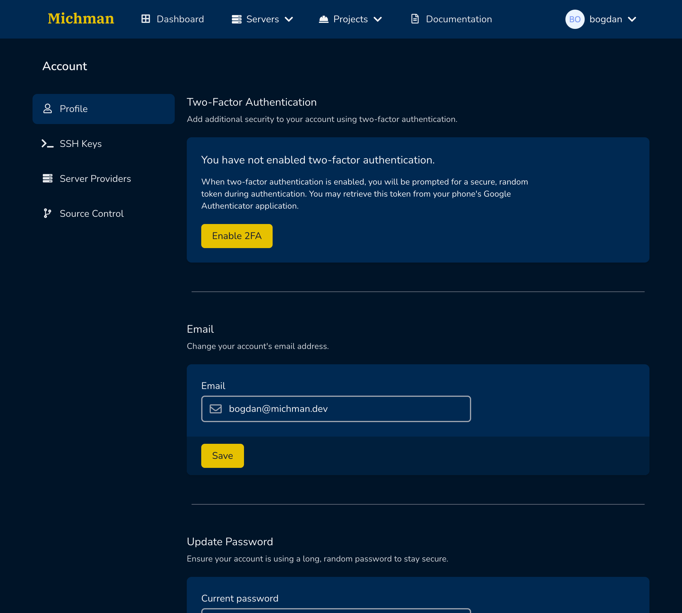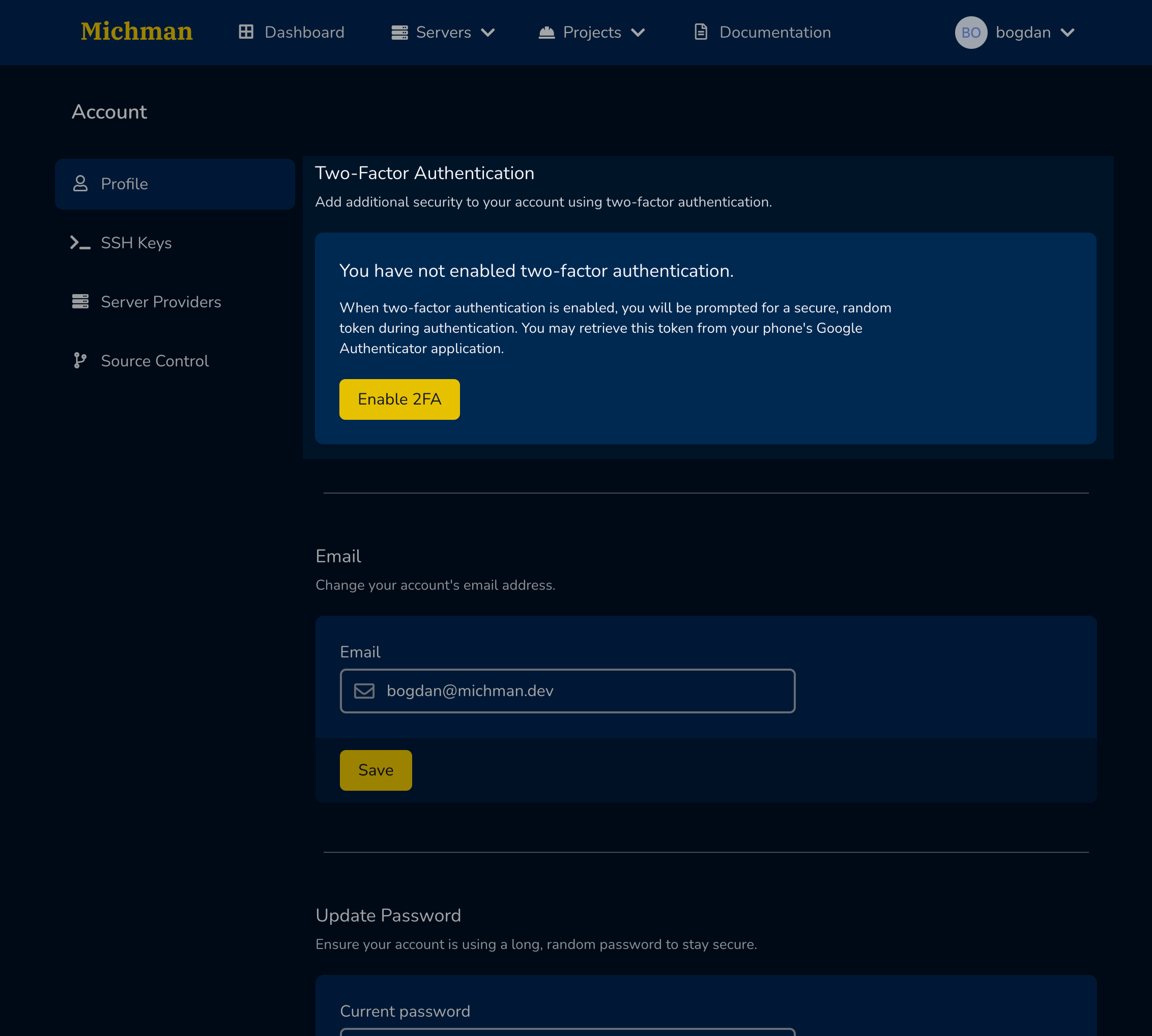 We took a number of measures, like time-limited sessions, two-factor authentication, email verification and OAuth to keep your Michman account secure.
