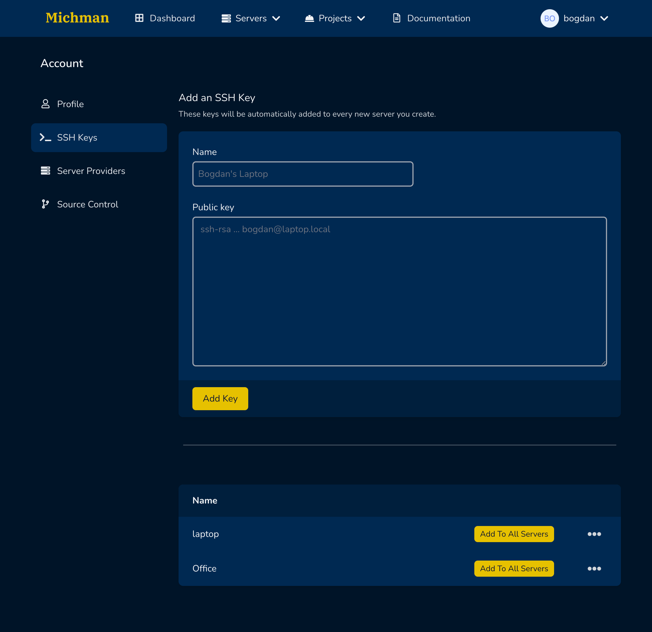 Copy-paste your public SSH keys into your account and Michman will automatically add these keys to all your servers, so you could securely access them via SSH if needed.